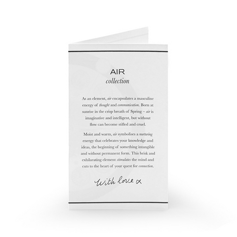 As an element, air encapsulates a masculine energy of thought and communication. Born at sunrise in the crisp breath of Spring ~ air is imaginative and intelligent, but without flow can become stifled and cruel. Moist and warm, air symbolises a nurturing energy that celebrates your knowledge and ideas, the beginning of something intangible and without permanent form. This brisk and exhilarating element stimulates the mind and cuts to the heart of your quest for connection.