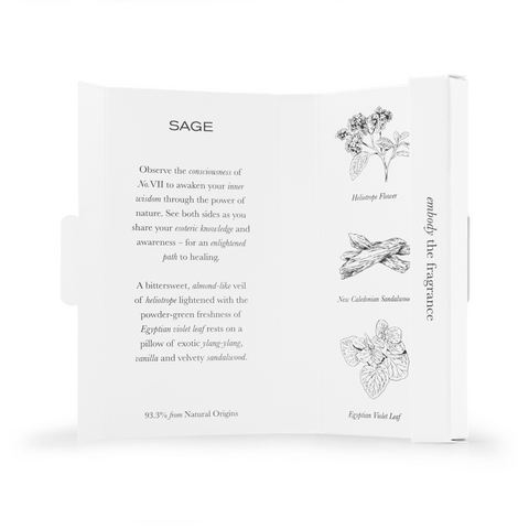 Discover the generous wisdom of SAGE (No.VII of XII), which signifies the seeker of knowledge. This floral powdery perfume is veiled in the sophisticated almond-like scent of heliotrope flower combined with classic and romantic violet ~ SAGE is warmed by gourmand notes of vanilla, sensual ylang ylang, and grounding sandalwood. Our delicate floral powdery eau de parfum is an elegant celebration of the consciousness and self-knowledge gained through observing the power of nature.