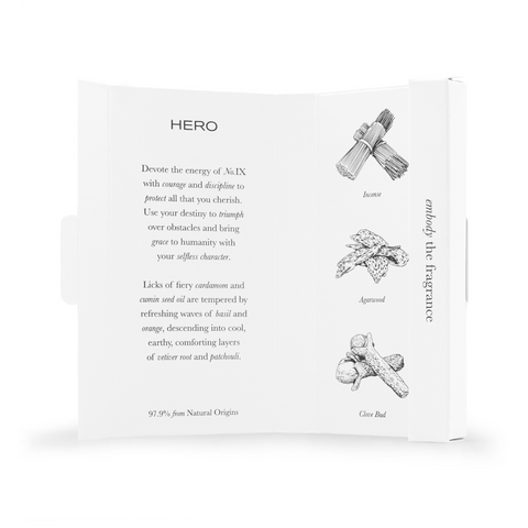 HERO (No.IX of XII) is a smoky woody fragrance, an inspired novel twist on patchouli with deep earthy, spiced notes of cardamom, clove and incense embers. A surprising freshness lies beneath the fire element of this fragrance, as the smokiness is tempered by subtle notes of orange and green basil, while vetiver and oakmoss lend depth. Symbolised by the number IX and its capacity for courage, discipline, and self-sacrifice, enigmatic HERO is a unisex fragrance for those who seek to step into their own power, having nurtured humility along the way.
