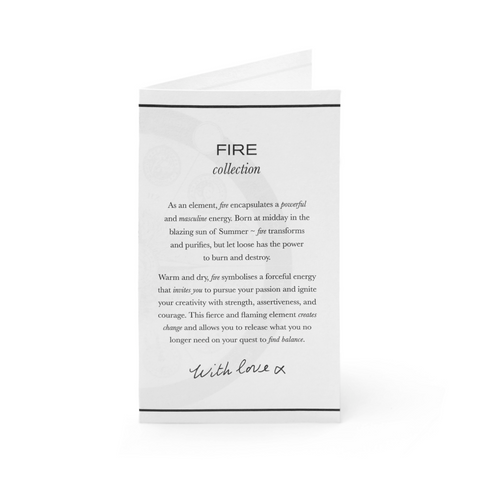 As an element, fire encapsulates a powerful and masculine energy. Born at midday in the blazing sun of Summer ~ fire transforms and purifies, but let loose, has the power to burn and destroy. Warm and dry, fire symbolises a forceful energy that invites you to pursue your passion and ignite your creativity with strength, assertiveness, and courage. This fierce and flaming element creates change and allows you to release what you no longer need on your quest to find balance.