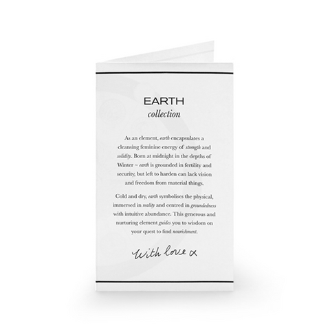 As an element, earth encapsulates a cleansing feminine energy of strength and solidity. Born at midnight in the depths of Winter ~ earth is grounded in fertility and security, but left to harden can lack vision and freedom from material things. Cold and dry, earth symbolises the physical, immersed in reality and centred in groundedness with intuitive abundance. This generous and nurturing element guides you to wisdom on your quest to find nourishment.